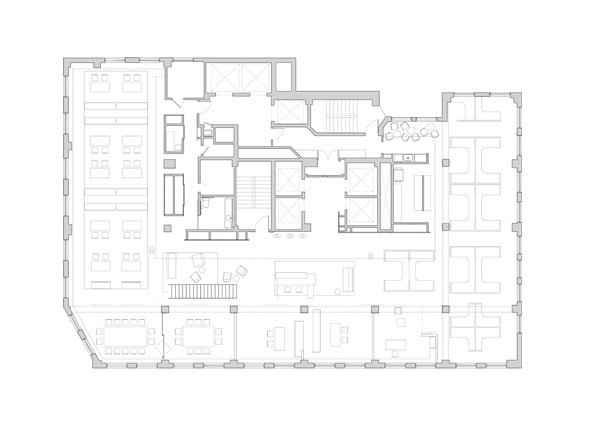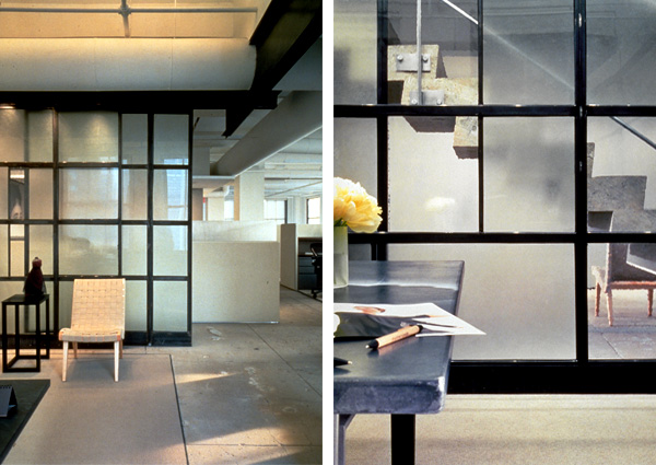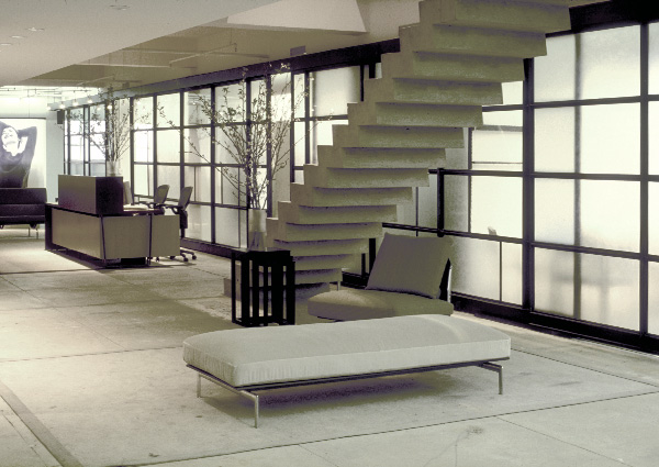 The showroom's spectacular views of frenetic Manhattan and the Hudson River are counterbalanced by the exposed concrete structure and floor. The offices and interactive video-ready conference room along the north exterior wall are read as layers of different spaces against the landscape of city rooftop views.