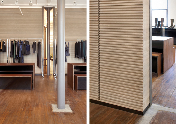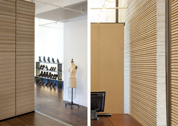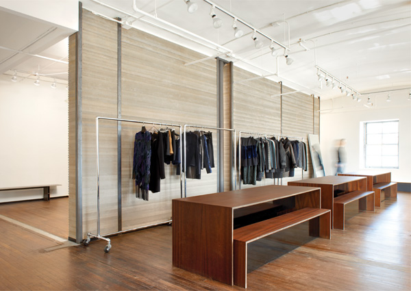 Inspired by the Proenza Schouler aesthetic and working within a modest budget, CDR Studio chose to use one material — homosote — as a wall material in order to provide a neutral background for the new space. Homosote was used to create walls with minimal "construction;" the material was stacked either horizontally or vertically to create different textural effects. The original vaulted ceiling spaces were cleaned and minimally constructed walls were then inserted. The main showroom walls were made of thick homosote roof decking stacked horizontally to create a dense, simple and textured background for the clothing. Full panels of the material were set vertically as screen elements, providing some privacy to the other areas of the program.